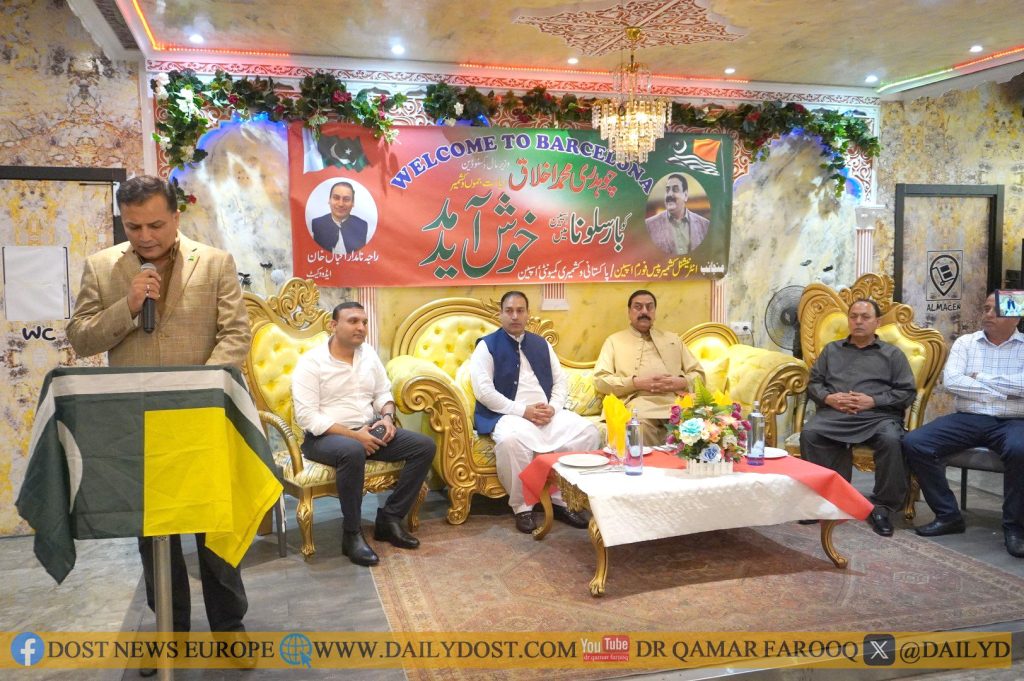بارسلونا(دوست نیوز) انٹرنیشنل کشمیر پیس فورم اسپین کے صدرمعروف کشمیری رہنما ایڈووکیٹ راجہ نامدار اقبال خان نے ان کی دعوت پر آئے وزیرِ مال و کسٹوڈین ریاست آزاد جموں و کشمیر، چوہدری محمد اخلاق کے اعزاز میں قرطبہ ریسٹورنٹ پورٹ فورم پر استقبالیہ دیا۔جس میں پاکستانی وکشمیری کمیونٹی کی بڑی تعداد نے شرکت کی۔