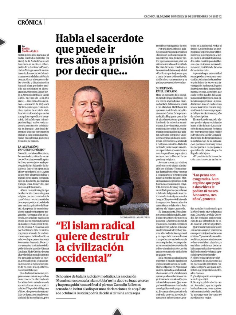 بارسلونا: اسپین کے شہر مالاگا کی ایک عدالت میں 1 اکتوبر کو پادری کستودیو بالیستر (61) کے خلاف مقدمے کی سماعت متوقع ہے، جس میں انہیں اسلام مخالف بیان دینے اور نفرت انگیزی کے جرم میں تین سال قید کی سزا کی درخواست کی گئی ہے۔ یہ مقدمہ “مسلمانان کنترا اسلاموفوبیا” نامی تنظیم نے دائر کیا ہے، جنہوں نے مارچ 2017 میں بالیستر اور دیگر پادریوں کے ایک ٹی وی پروگرام میں کیے گئے بیانات کو بنیاد بنایا۔