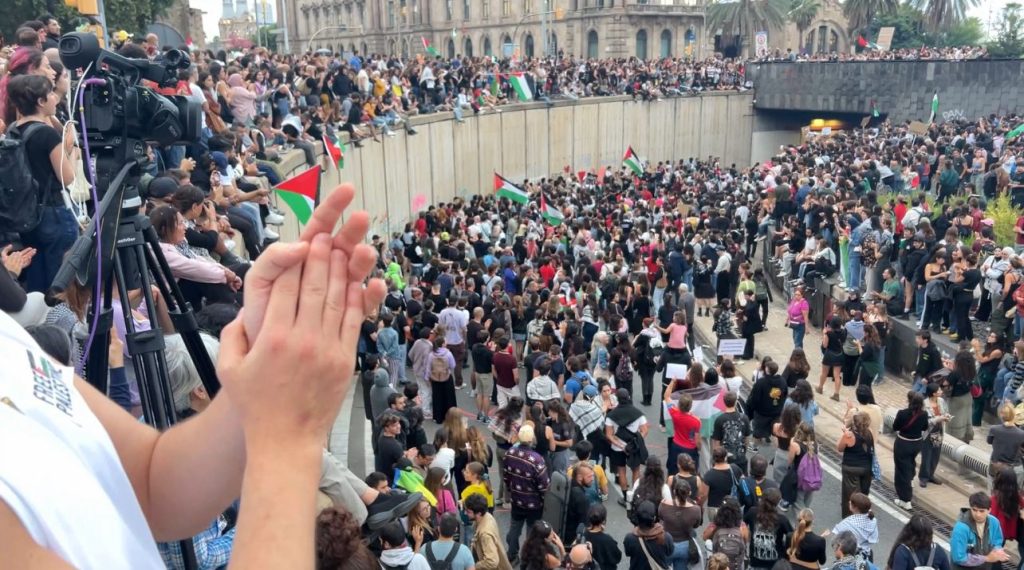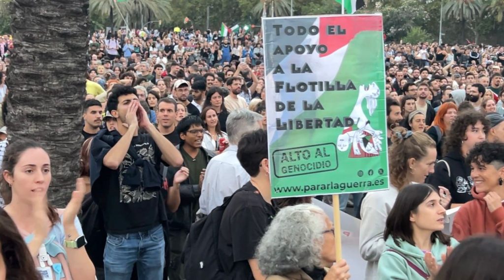 بارسلونا | 2 اکتوبر 2025/دوست نیوز/بارسلونا کے Plaça de la Carbonera میں ہزاروں افراد نے اسرائیلی فوج کی جانب سے گلوبل صمود فلوٹیلا کو روکنے کے خلاف احتجاج کیا۔ یہ کشتیاں غزہ کے لیے انسانی ہمدردی کی امداد لے جا رہی تھیں جنہیں اسرائیلی فوج نے گزشتہ 24 گھنٹوں کے دوران ساحل تک پہنچنے سے پہلے ہی روک دیا۔
