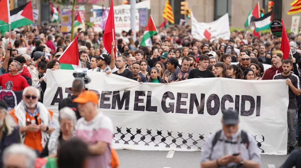 یہ مظاہرہ مرکزی طور پر شام 18:00 بجے پلاسا دے لا کاربونیرہ میں فلوٹیلا کے منتظمین کی جانب سے بلایا گیا تھا، جس میں ہزاروں شہری شریک ہوئے۔ مظاہرین کے ایک گروہ نے “الس بارّیس دے لا زونا نورد امب لا ریزیستنسیا فلسطینا” (شمالی علاقوں کے محلے فلسطینی مزاحمت کے ساتھ) کے بینر تلے شرکت کی اور شاہراہ میں داخل ہونے کی کوشش کی۔ شرکا “بائیکاٹ اسرائیل” کے نعرے لگاتے اور یہ دعویٰ کرتے رہے کہ غزہ میں جو کچھ ہو رہا ہے وہ جنگ نہیں بلکہ “نسل کشی” ہے۔ ان کے ہاتھوں میں فلسطینی پرچم بھی تھے۔