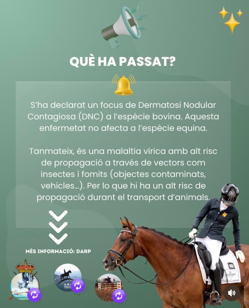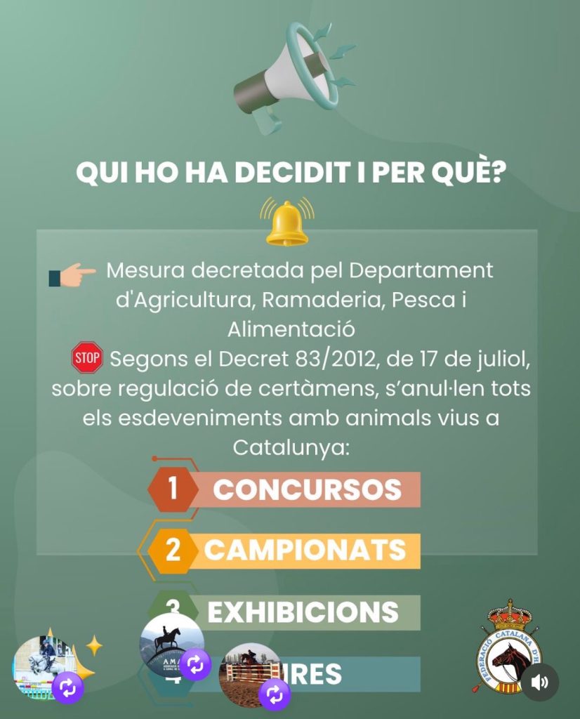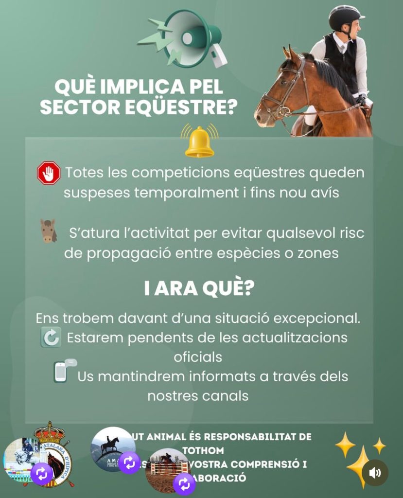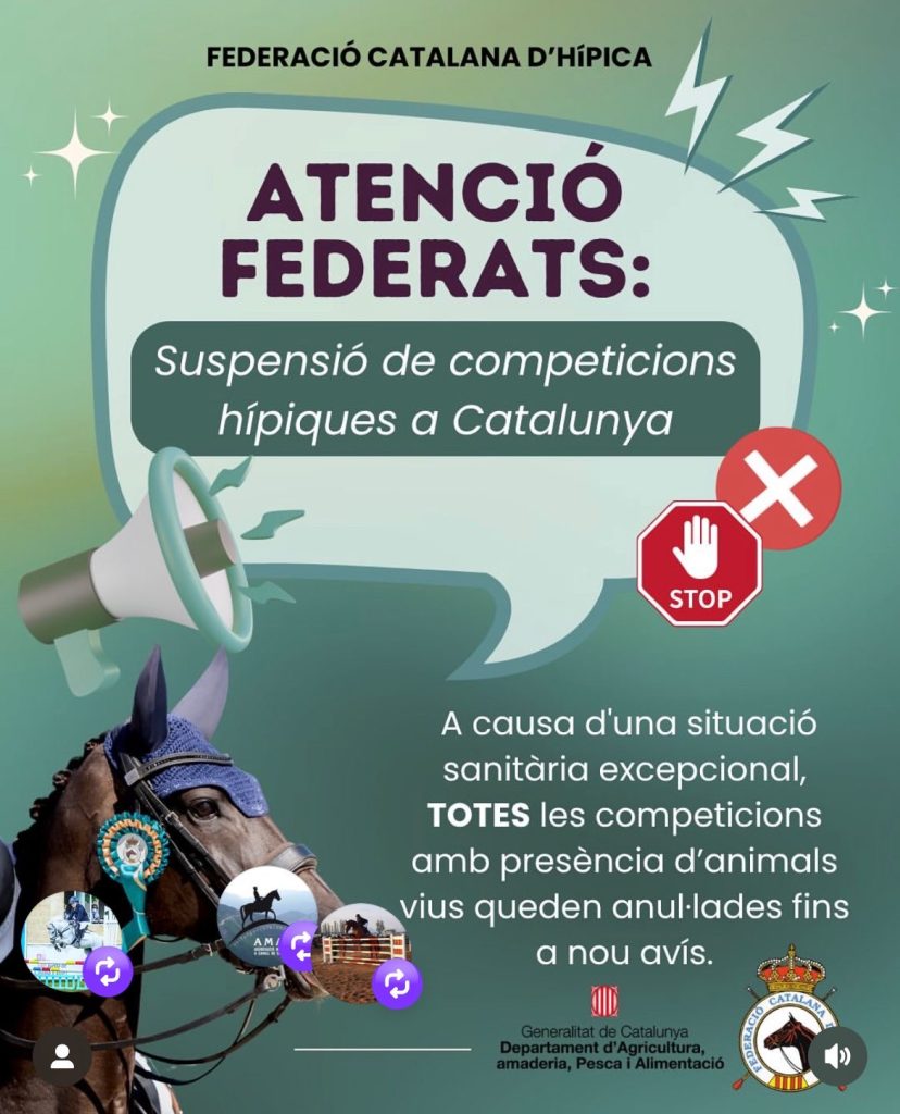 اسی وجہ سے کاتالونیا میں تمام گھڑ سواری اور گھوڑوں سے متعلق مقابلے، نمائشیں اور تقریبات کو عارضی طور پر منسوخ کر دیا گیا ہے۔ یہ فیصلہ جنرالیتات دے کاتالونیا (Generalitat de Catalunya) کے زیرِ انتظام محکمہ زراعت، مویشی پروری، ماہی گیری اور خوراک نے کیا ہے، ڈیکری 83/2012 کے تحت، جو زندہ جانوروں کی موجودگی والے میلوں اور مقابلوں کی ضابطہ کاری سے متعلق ہے۔