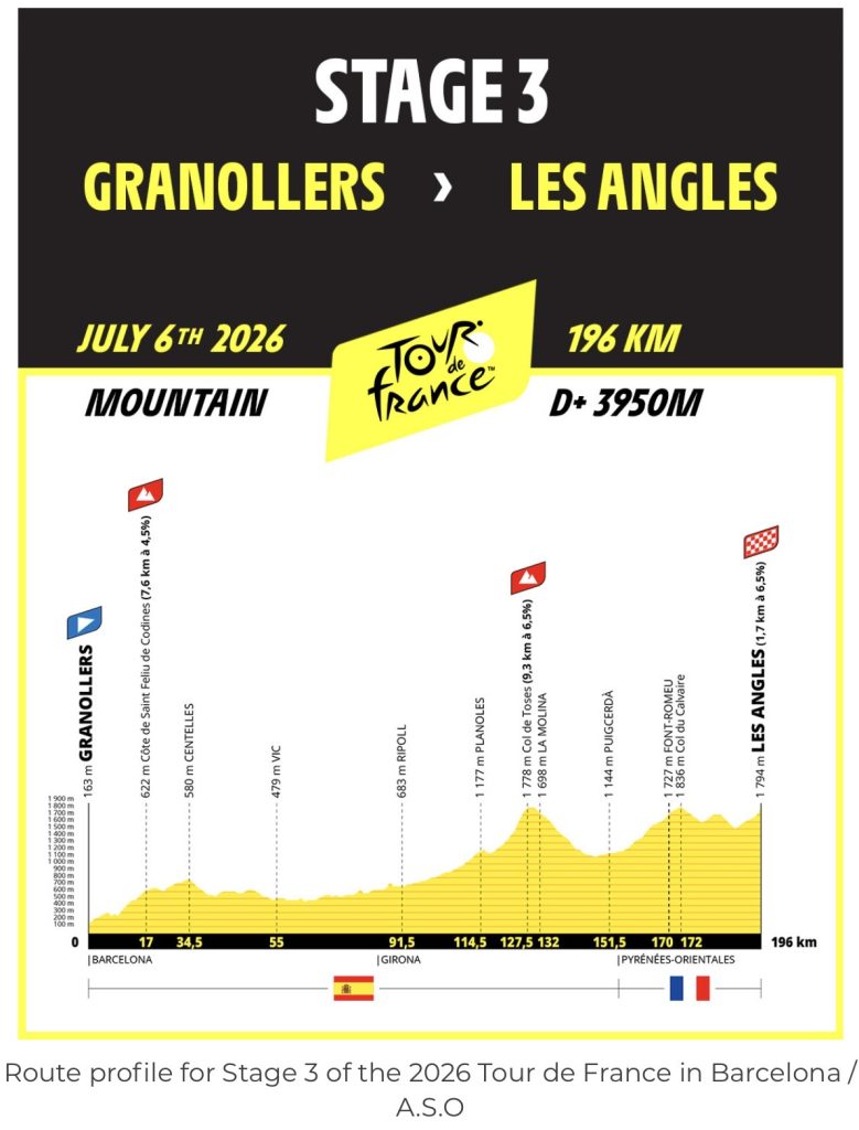 بارسلونا(دوست مانیٹرنگ ڈیسک)ٹور ڈی فرانس 2026 کا تیسرا مرحلہ کاتالونیا سے گزرتے ہوئے گرانوییرس سے شروع ہو کر شمالی کاتالونیا کے شہر لیس آنگلز (Les Angles) میں اختتام پذیر ہوگا، جو اب فرانس کا حصہ ہے۔ اس مرحلے کی مجموعی طوالت 196 کلومیٹر ہوگی اور اس دوران تقریباً 3,950 میٹر کی بلندی عبور کی جائے گی۔