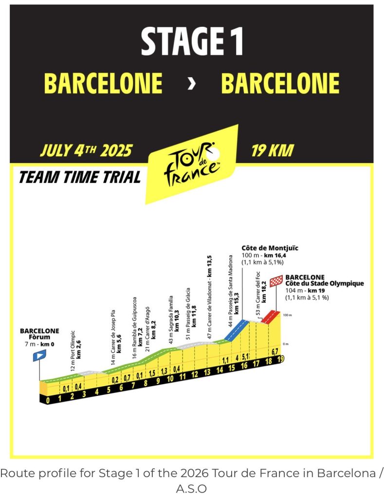 پہلا مرحلہ 4 جولائی کو بارسلونا سے شروع ہوگا، جو کہ ٹور کی تاریخ میں پہلا موقع ہے جب گرینڈ ڈیپارٹ (Grand Départ) اس شہر سے ہو گا۔ یہ 19.7 کلومیٹر طویل ٹیم ٹائم ٹرائل ہوگا جو پارک ڈیل فورم سے شروع ہو کر سمندری شاہراہ، ساگرادا فامیلیا کے سامنے سے گزرتا ہوا مونتجُوک پر ختم ہوگا۔ اگرچہ یہ ٹیم ٹائم ٹرائل ہوگا، لیکن انفرادی کارکردگی کو عمومی درجہ بندی کے لیے شمار کیا جائے گا۔