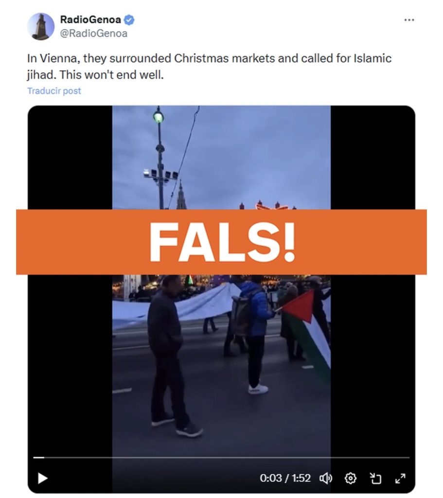 اسی طرح ویانا میں بھی ایک فلسطین نواز مظاہرے کی ویڈیو کو یہ کہہ کر پھیلایا گیا کہ کرسمس بازار میں خوف و ہراس پھیل گیا۔ حقیقت یہ ہے کہ یہ مظاہرہ 28 نومبر کو اپنے معمول کے روٹ پر تھا اور راستے میں Rathausplatz کے کرسمس بازار کے سامنے سے گزرا۔ پولیس کے مطابق نہ کوئی جہادی نعرے لگے اور نہ ہی کوئی سنگین واقعہ پیش آیا۔