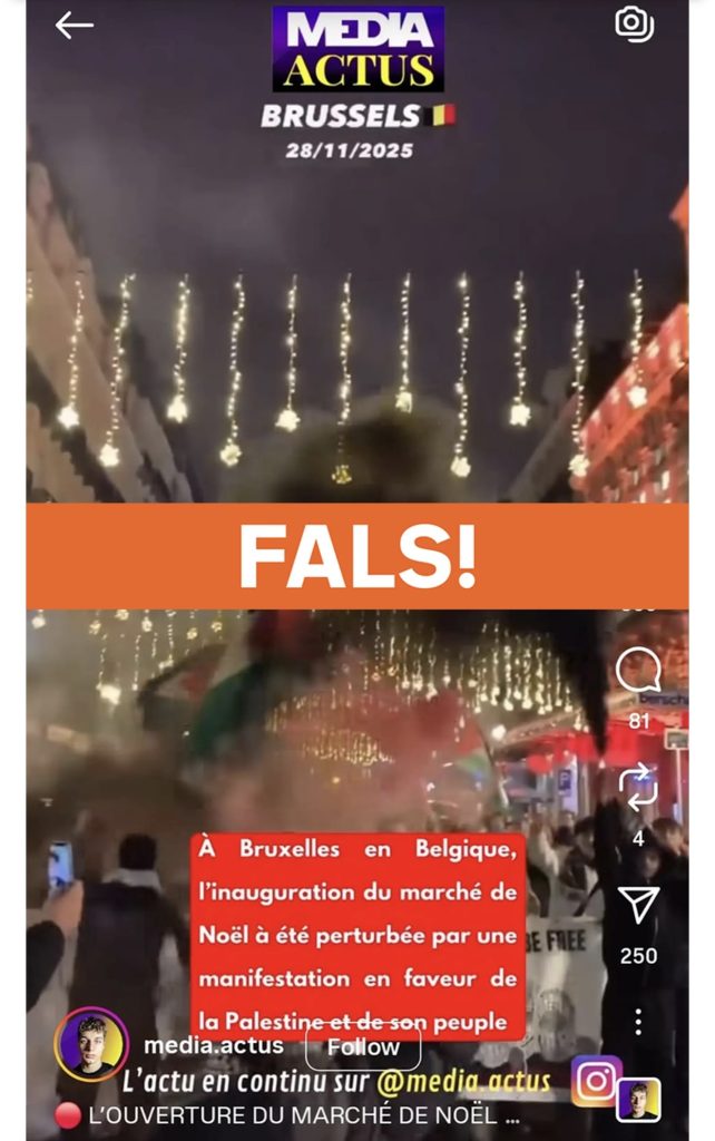 سوشل میڈیا پر سب سے زیادہ وائرل ہونے والی ایک ویڈیو برسلز کے کرسمس بازار کے سامنے فلسطین کے حق میں ہونے والے مظاہرے کی ہے۔ یہ مظاہرہ واقعی 28 نومبر کو بازار کے افتتاح کے دن ہوا، مگر اسے کرسمس بازار کے خلاف یا اس کے بائیکاٹ کے طور پر منظم نہیں کیا گیا تھا۔ یہ دراصل تنظیم “اہرار فلسطین” کی جانب سے گزشتہ دو برسوں سے ہر جمعے کو برسلز اسٹاک ایکسچینج کے سامنے ہونے والا معمول کا احتجاج تھا، جو اتفاقاً اسی دن بازار کے افتتاح کے ساتھ ٹکرا گیا۔