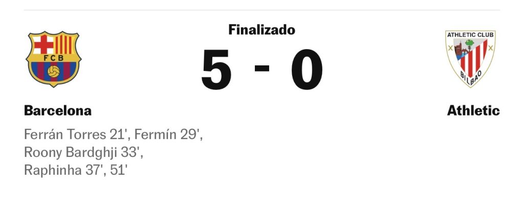 دوسرے ہاف میں بھی کھیل کا نقشہ نہ بدلا اور بارسلونا مسلسل ایتھلیٹک کی دفاعی لائن پر دباؤ ڈالتا رہا۔ وقفے کے فوراً بعد رافینیا نے ایک ڈھیلی گیند پر قابو پا کر اپنا دوسرا گول کیا اور ایتھلیٹک کی واپسی کی تمام امیدیں ختم کر دیں۔