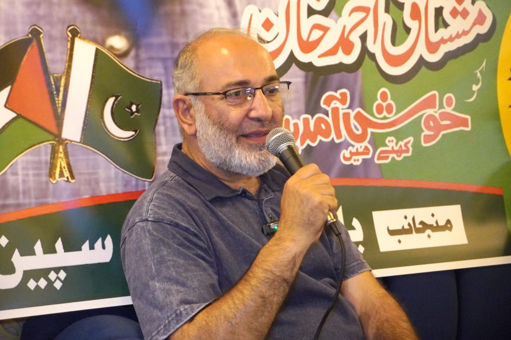 سابق سینیٹر مشتاق احمد خان نے اپنے خطاب میں کہا مشرقِ وسطیٰ میں فلسطین پہلے ہی ایک اہم اور حساس مسئلہ تھا، لیکن حالیہ حالات نے اسے عالمی سیاست، معیشت اور سفارت کاری کا مرکزی محور بنا دیا ہے۔ آج یہ بات واضح ہو چکی ہے کہ فلسطین صرف ایک علاقائی تنازع نہیں بلکہ ایک بنیادی اور جڑ (روٹ کاز) مسئلہ ہے۔ جب تک اس مسئلے کو انصاف اور عدل کی بنیاد پر حل نہیں کیا جاتا، نہ پائیدار امن قائم ہو سکتا ہے، نہ معیشت مستحکم ہو سکتی ہے اور نہ ہی عالمی سفارت کاری کامیاب ہو سکتی ہے۔
